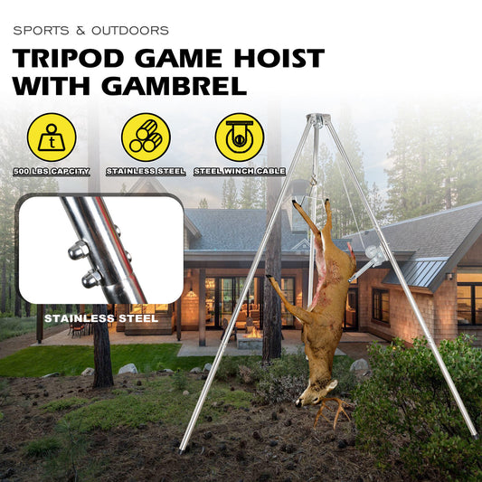 Stainless Steel Deer Game Hoist: A Robust Stand for Hunting, Processing, and Skinning, Equipped with a 500lb Capacity Gambrel and Manual Winch for Heavy-Duty Use.