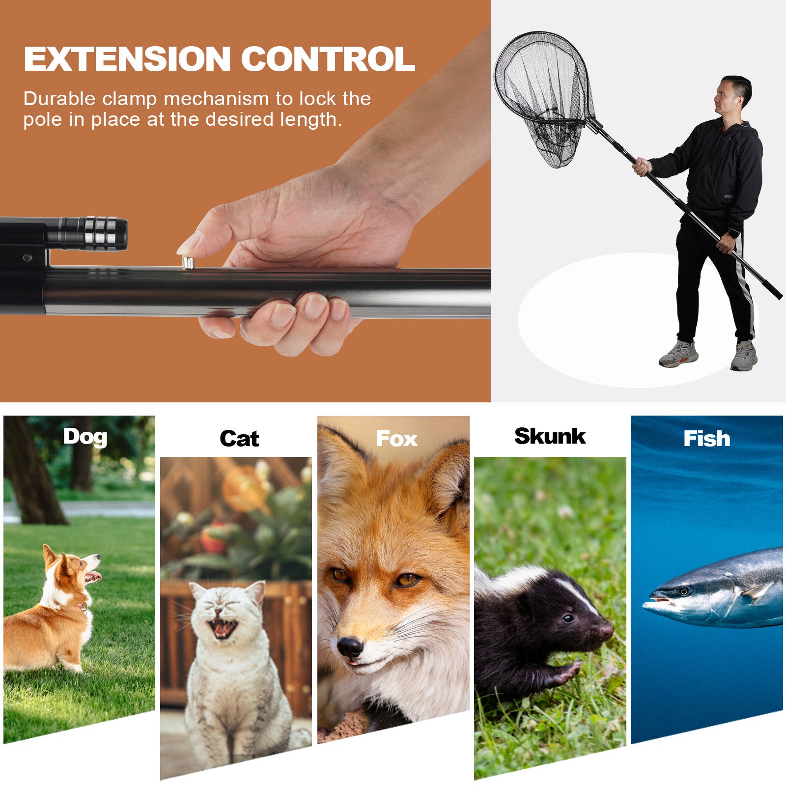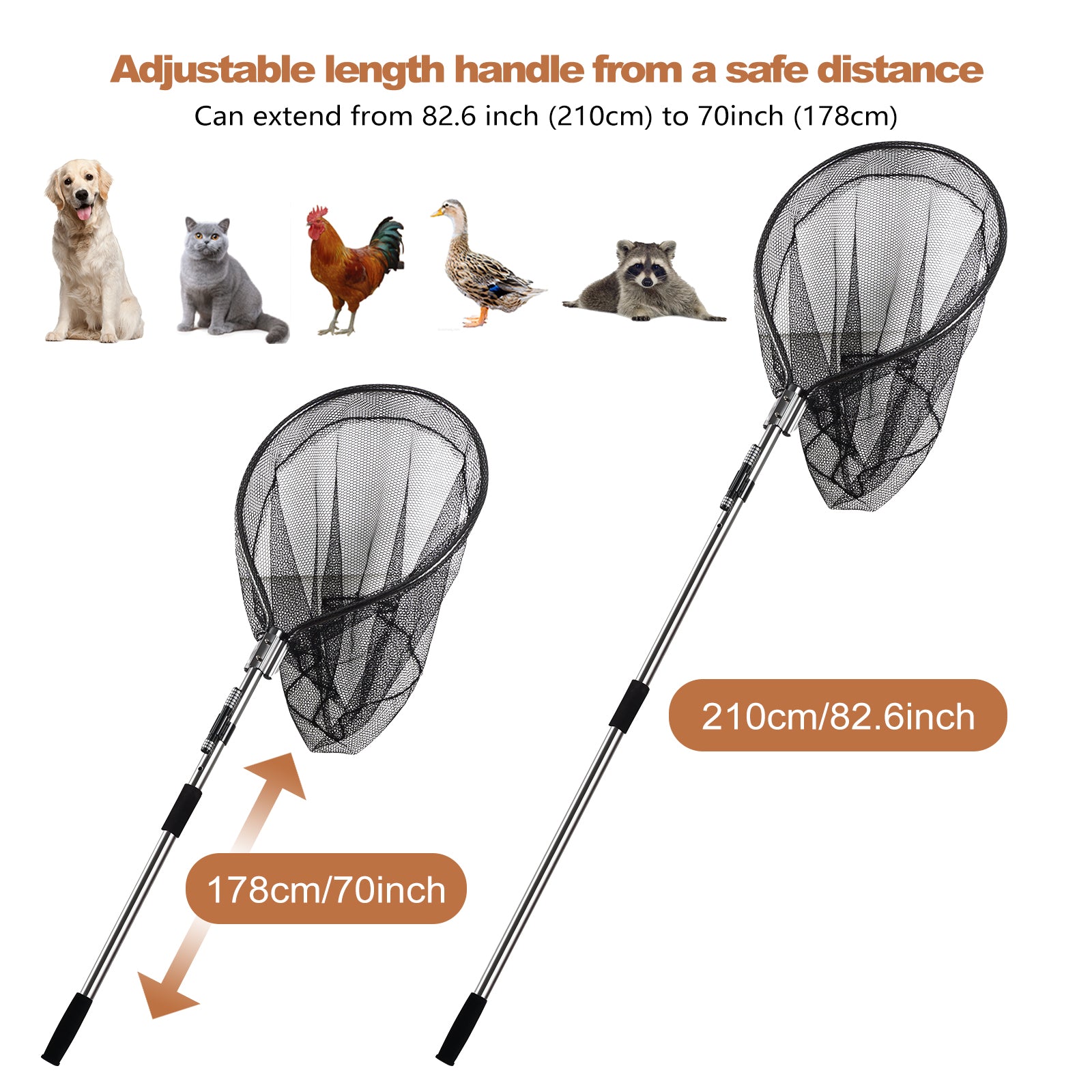 The Dog Catch Net is versatile, suitable for capturing various animals like chickens, raccoons, ducks, geese, skunks, bats, guinea fowl, feral cats, pigeons, and even tuna. Its professional design boasts an extendable aluminum alloy pole with an adjustable mechanism, allowing adaptability for different animal control scenarios.
