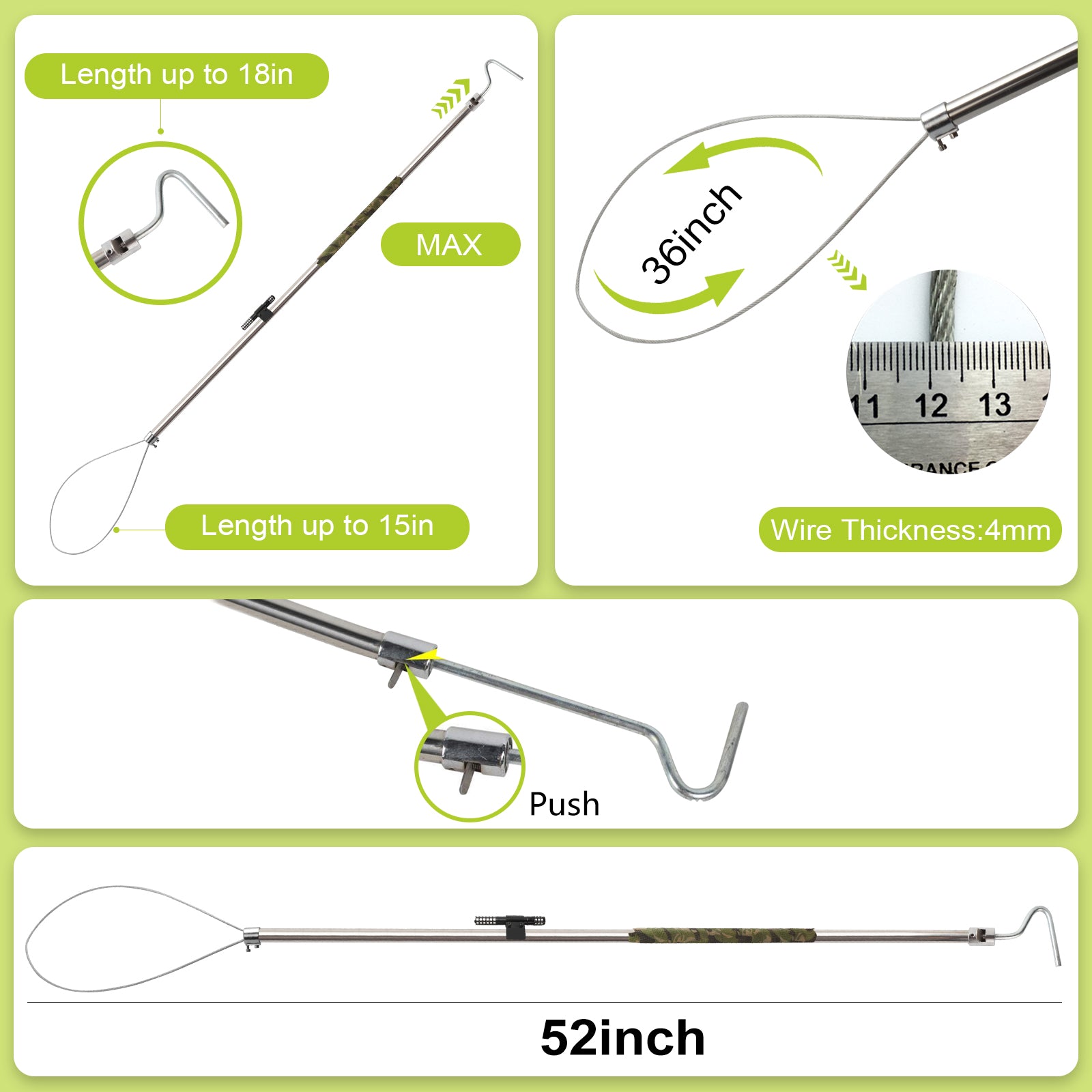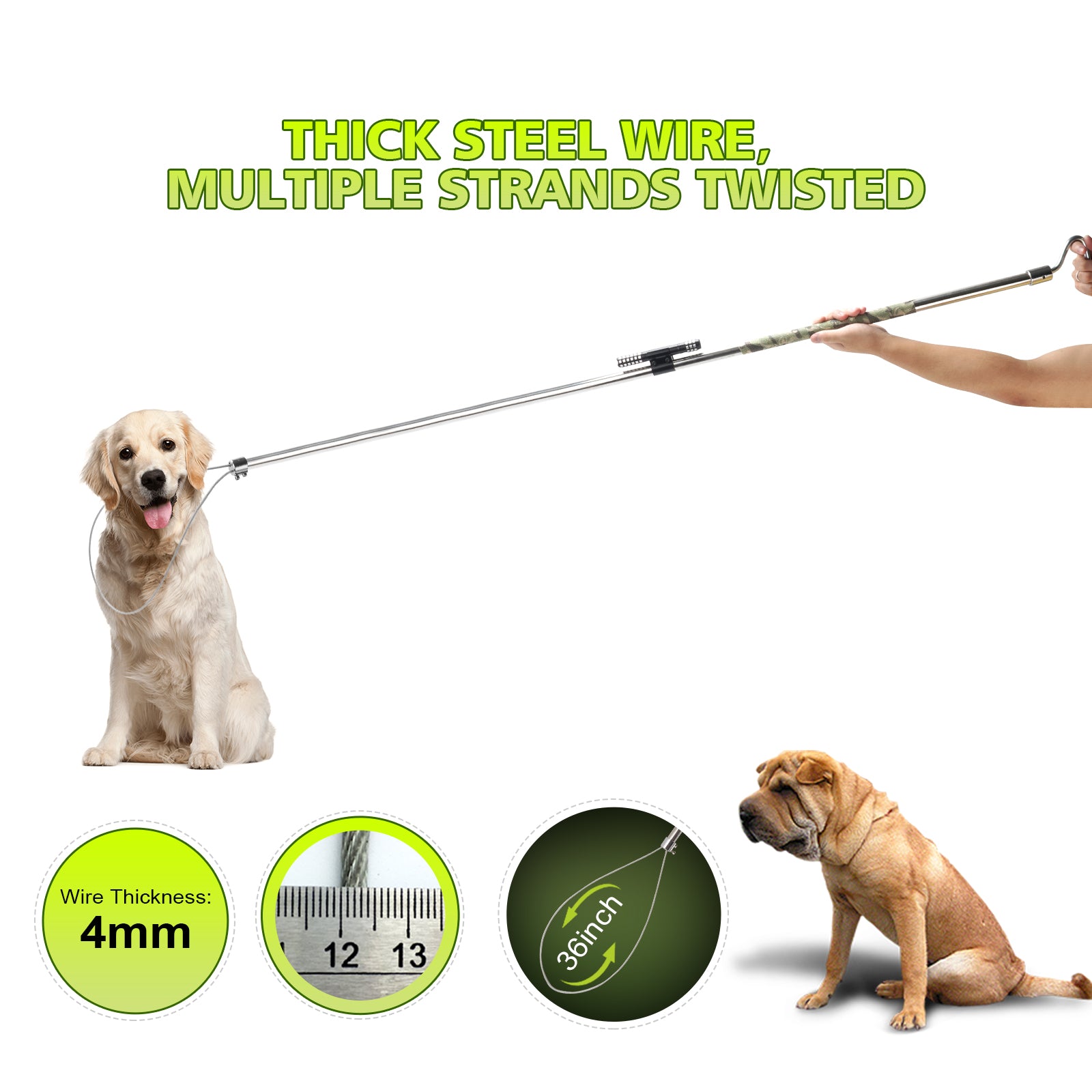 The Dog Catch Pole Tool efficiently captures animals with its simple and robust structure, allowing for easy operation and durability. It enables a single person to manage both catching and other activities effectively. This versatile Animal Catcher Pole Kit can handle various wildlife like bulldogs, pigs, coyotes, hogs, squirrels, rabbits, skunks, raccoons, stray cats, moles, chipmunks, gophers, chickens, opossums, groundhogs, and similar-sized animals.