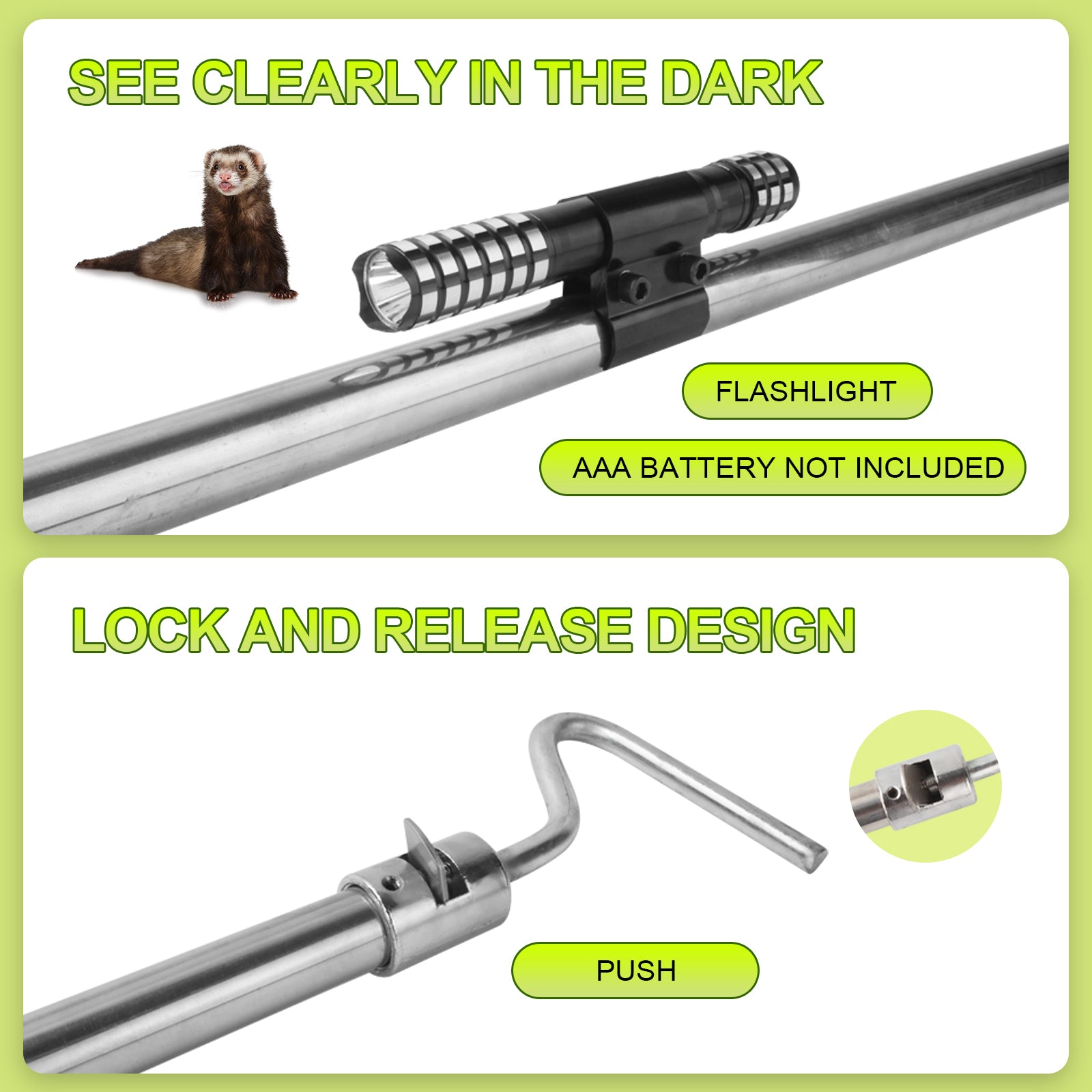 Designed to minimize harm to animals, this removal pole tool kit aids in removing wildlife from gardens or houses, ensuring reduced harm during control measures. Its flashlight feature supports night operations, particularly under decks or in attic floors, aiding in animal capture.