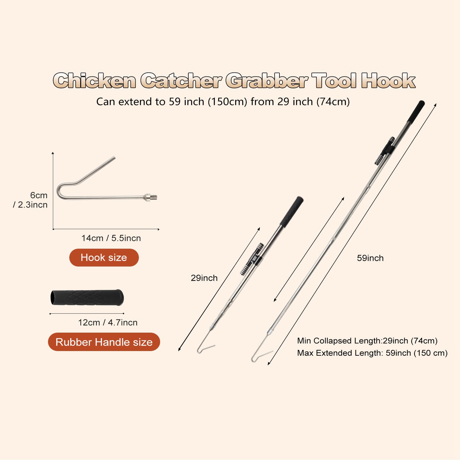 The Chicken Catcher grabber tool Hook spans approximately 74 cm/29 inches and extends to a maximum length of 150 cm/59 inches, allowing you to adjust its length according to your specific usage requirements.
